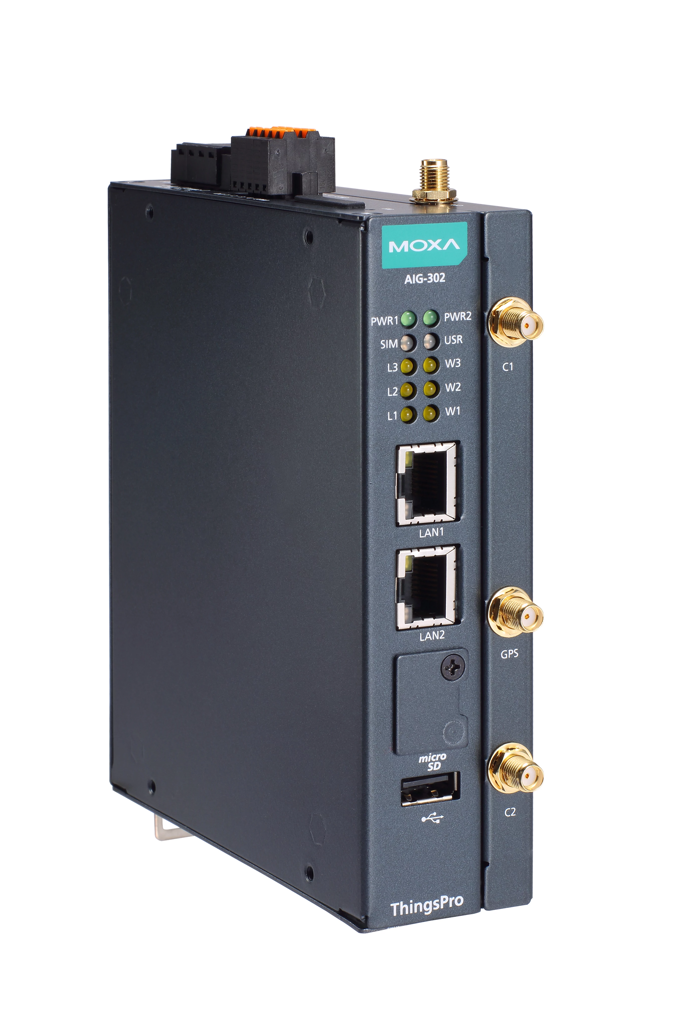Moxa AIG-302-T-AZU-LX 2 portos Modbus RTU/ASCII/TCP – MQTT és Azure felhő-kapcsolatra kész gateway, Arm® Cortex™-A7 kétmagos, 1 GHz-es processzorral, Azure IoT Edge szoftverrel, -40 és 70 °C közötti működési hőfoktartomány.