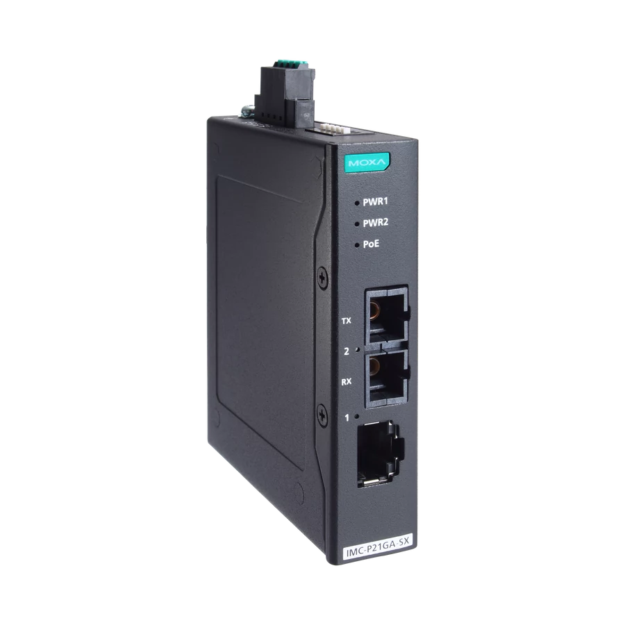 A Moxa IMC-P21GA-G2 sorozatú PoE+ Gigabites Ethernet–optikai médiakonverterek megbízható és stabil 10/100/1000BaseT(X) – 100/1000Base-SX/LX vagy választható 100/1000Base SFP modulon keresztüli konverziót biztosítanak ipari környezetben. A konverterek PSE (Power Sourcing Equipment) eszközként működnek, vagyis közvetlenül képesek áramellátást biztosítani más PoE-képes (PD) eszközöknek, így nincs szükség külön tápegységre vagy plusz kábelezésre.