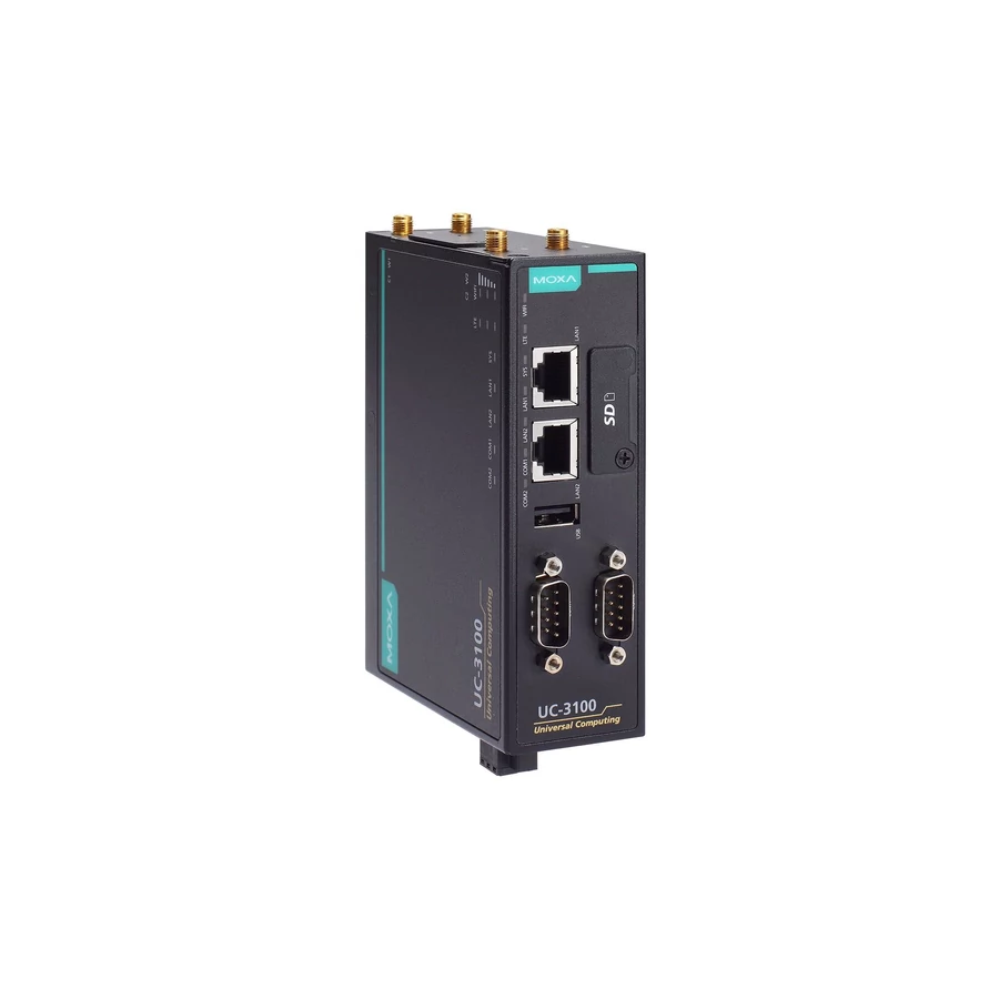 Moxa UC-3121-T-EU-LX Arm-alapú számítógép beépített LTE Cat. 1 és Wi-Fi a/b/g/n modullal, 1 GHz processzor, 1 GB RAM, 8 GB eMMC, 2 Ethernet port, 1 soros port, 1 CAN port, 1 USB port, 1 SD kártyafoglalat, -40 és 70°C közötti működési hőfoktartomány