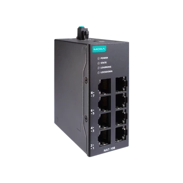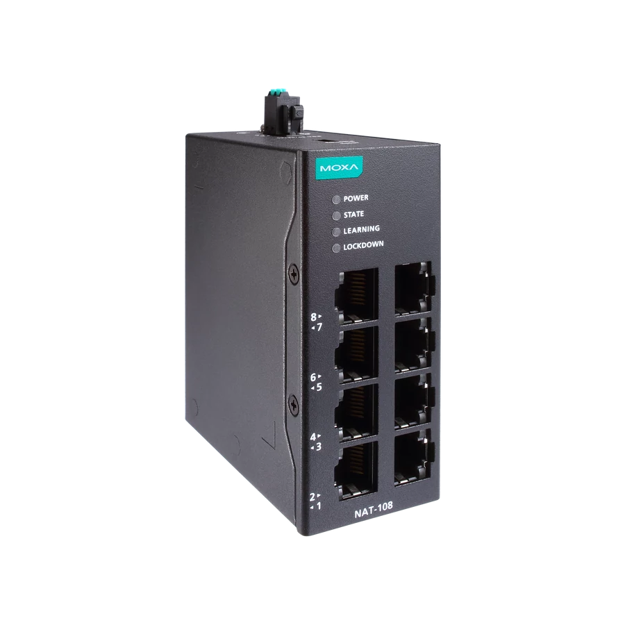 A Moxa NAT-108 sorozat ipari NAT eszközöket úgy tervezték, hogy leegyszerűsítsék az IP-konfigurációt a gépek és meglévő hálózati infrastruktúrák közötti kapcsolat kialakításakor, különösen gyártósori automatizálási környezetekben. A sorozat teljes NAT funkcionalitást kínál, köztük a piacvezető IP Twins Mapping 1:1 NAT technológiát, amely megoldja a LAN IP-ütközéseket a gyári eszközök között.