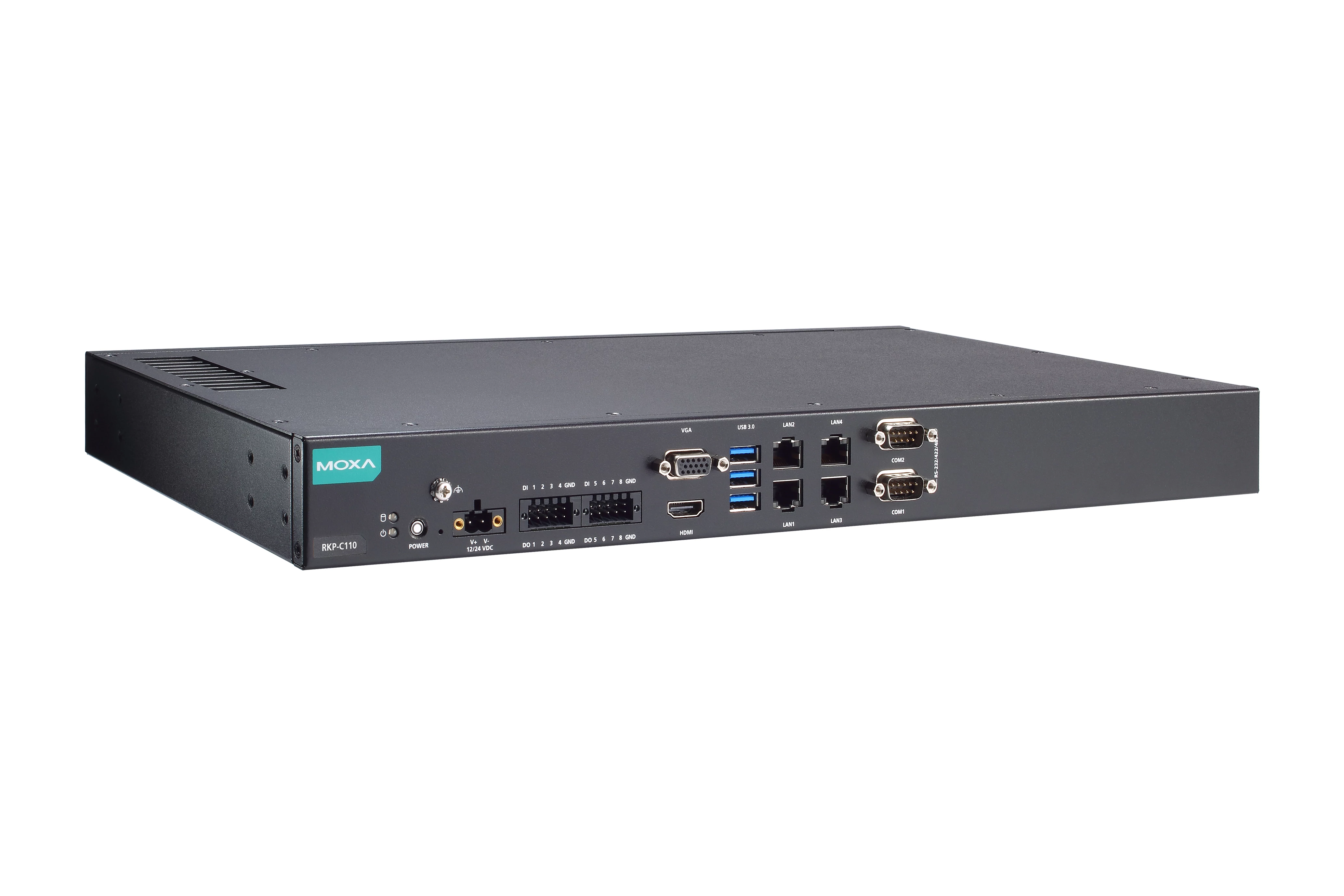 Moxa RKP-C110-C3-T 19" rack szerkénybe szerelhető 1U magas ipari számítógép: Intel® Core™ i3-1115G4E processzor, 4 LAN port, 2 soros port, 8 DI, 8 DO, 3 USB 3.0 port, 1 VGA port, 1 HDMI port, 2 SSD slot, 12 és 24V DC tápbemenet, -30-60 °C közötti működési hőfoktartomány. hőfoktartomány.