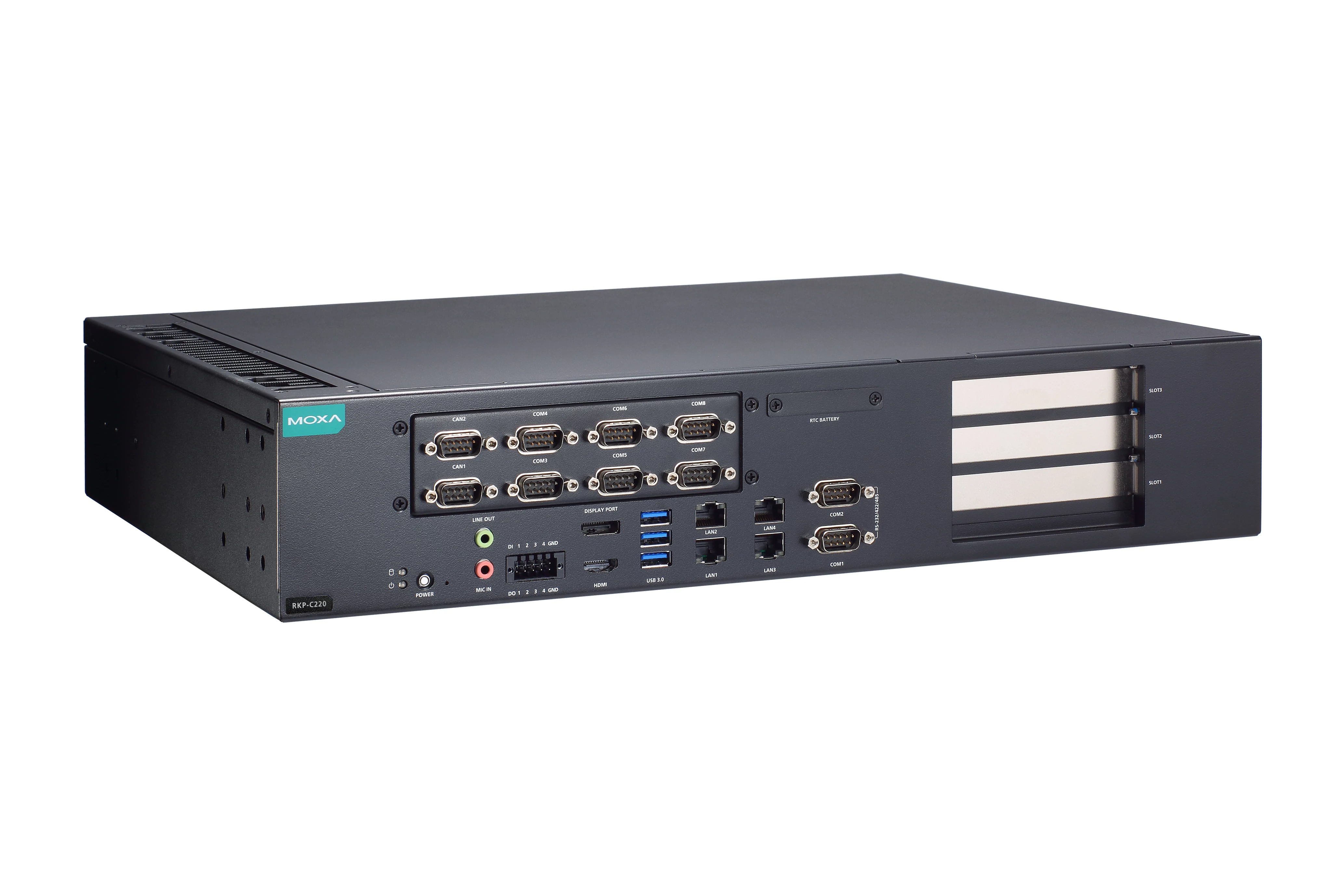 A Moxa RKP-C220 sorozat nagy teljesítményű, ventilátor nélküli ipari rackmount számítógépei 13. generációs Intel® Core™ i3, i5, i7 vagy i9 processzorokkal érhetők el, akár 24 maggal és 32 szállal, így könnyedén kiszolgálják a modern ipari alkalmazások igényeit. A készülékek rendkívül gazdag interfészkészlettel rendelkeznek: akár 8 gigabites Ethernet porttal, akár 10 Moxa saját tervezésű, szoftveresen választható RS-232/422/485 soros porttal, akár 2 CAN porttal, valamint 4 digitális bemenettel és 4 digitális kimenettel.