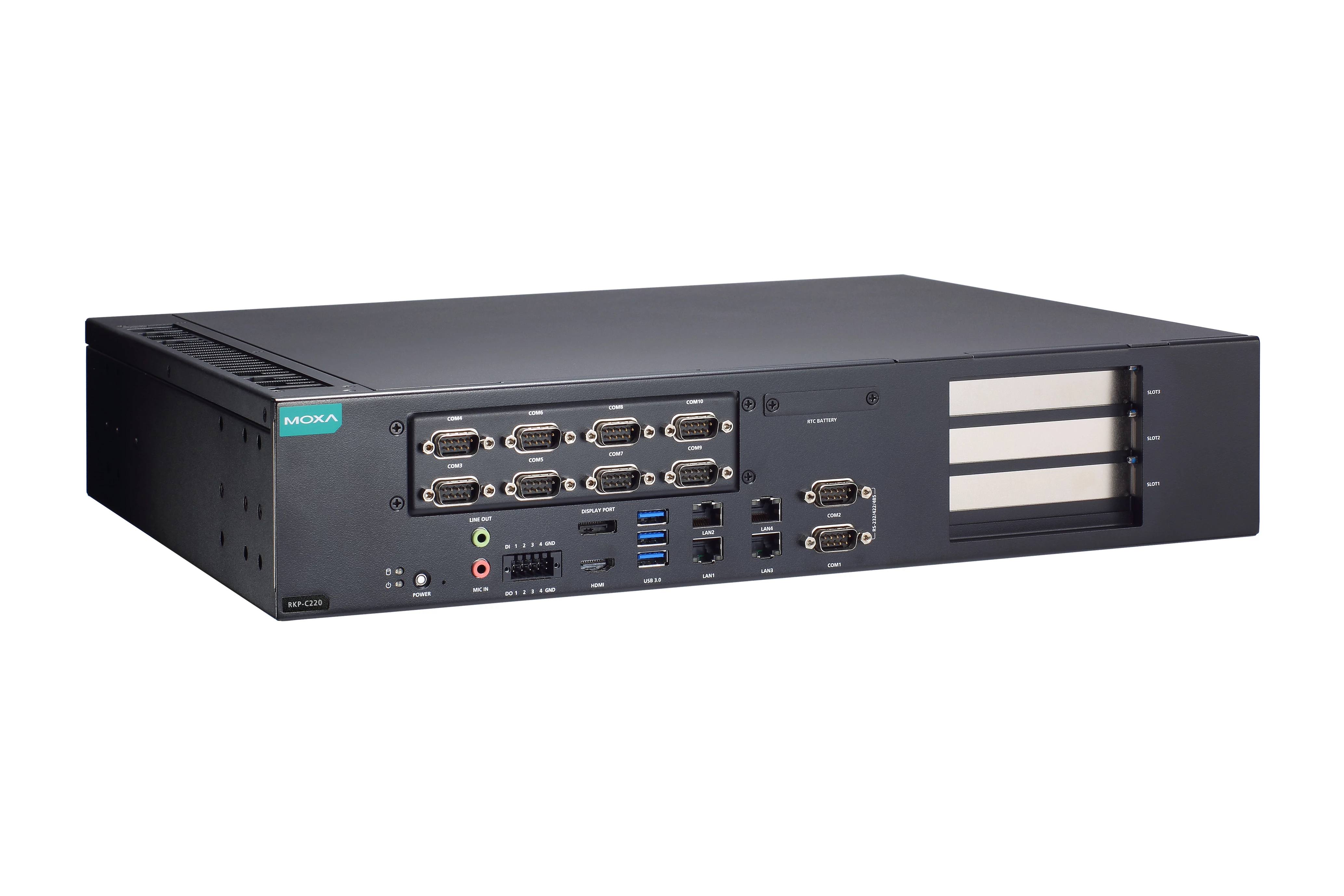 A Moxa RKP-C220 sorozat nagy teljesítményű, ventilátor nélküli ipari rackmount számítógépei 13. generációs Intel® Core™ i3, i5, i7 vagy i9 processzorokkal érhetők el, akár 24 maggal és 32 szállal, így könnyedén kiszolgálják a modern ipari alkalmazások igényeit. A készülékek rendkívül gazdag interfészkészlettel rendelkeznek: akár 8 gigabites Ethernet porttal, akár 10 Moxa saját tervezésű, szoftveresen választható RS-232/422/485 soros porttal, akár 2 CAN porttal, valamint 4 digitális bemenettel és 4 digitális kimenettel.