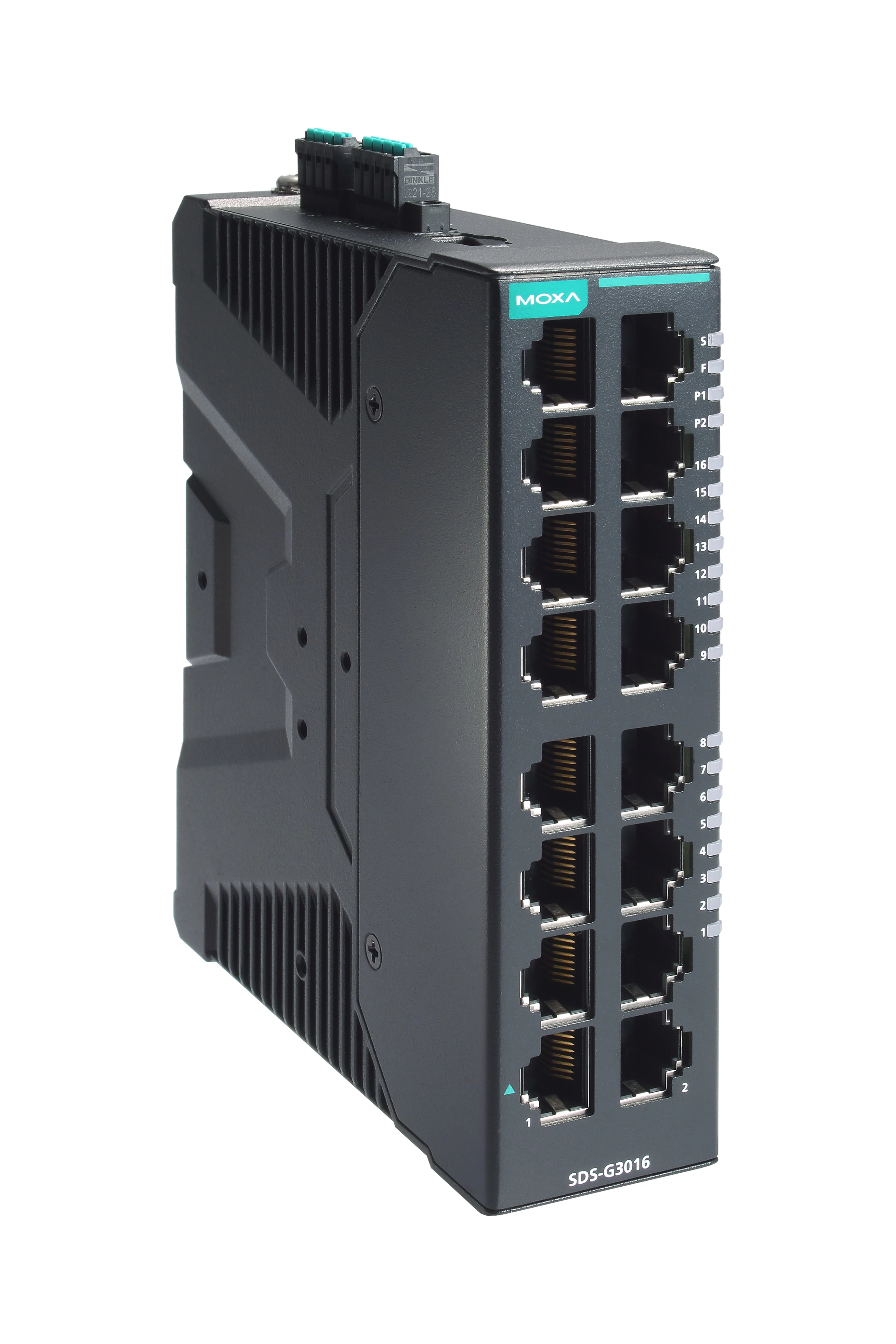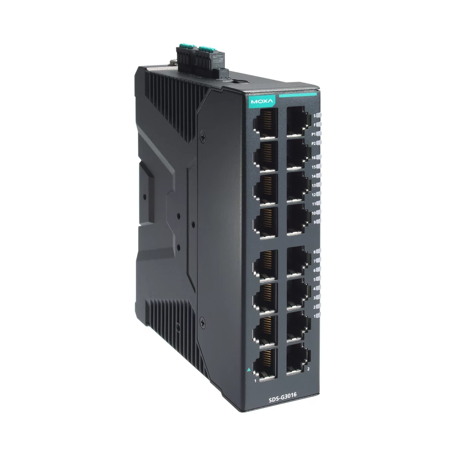 A Moxa SDS-G3016 egy kompakt, ipari full Gigabites intelligens Ethernet switch 16 10/100/1000BaseT(X) porttal, kettős 12/24/48 VDC tápellátással, -10 és 60 °C közötti működési hőfoktartománnyal.