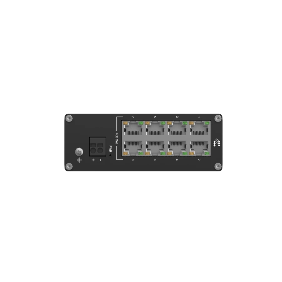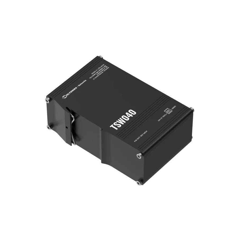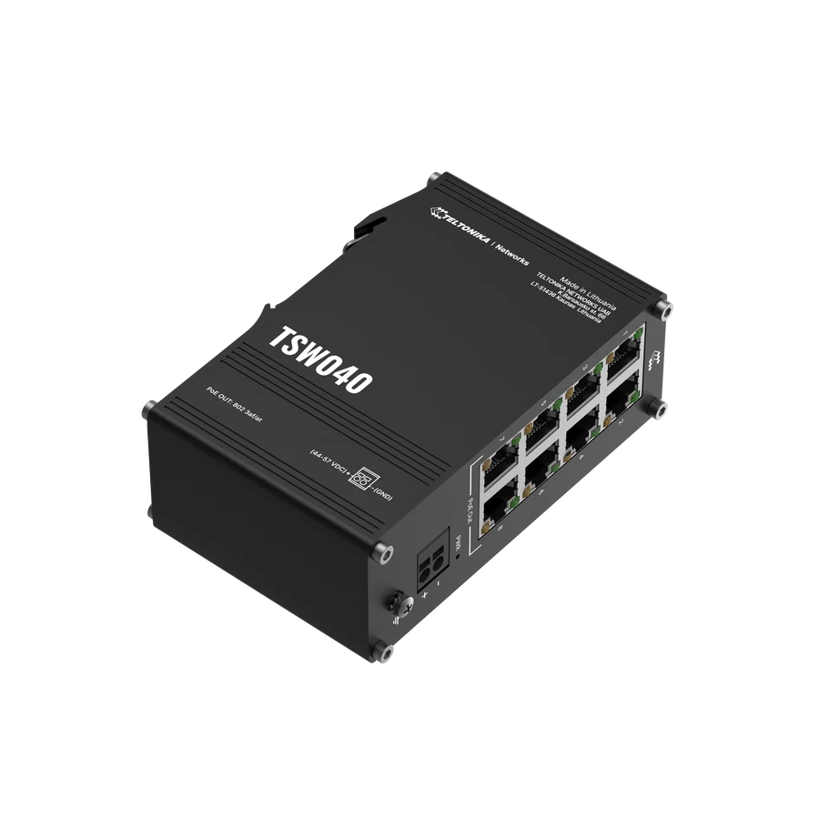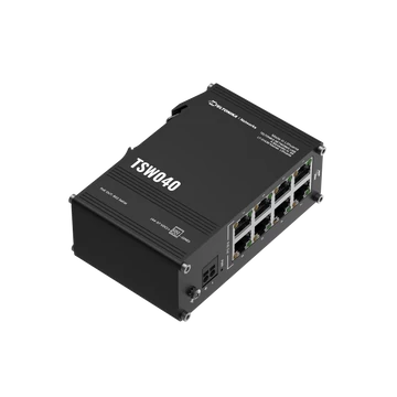 Teltonika TSW040 nem menedzselhető ipari Ethernet switch, amely 8 10/100 Mbps PoE+ Ethernet porttal és integrált DIN rögzítéssel rendelkezik.