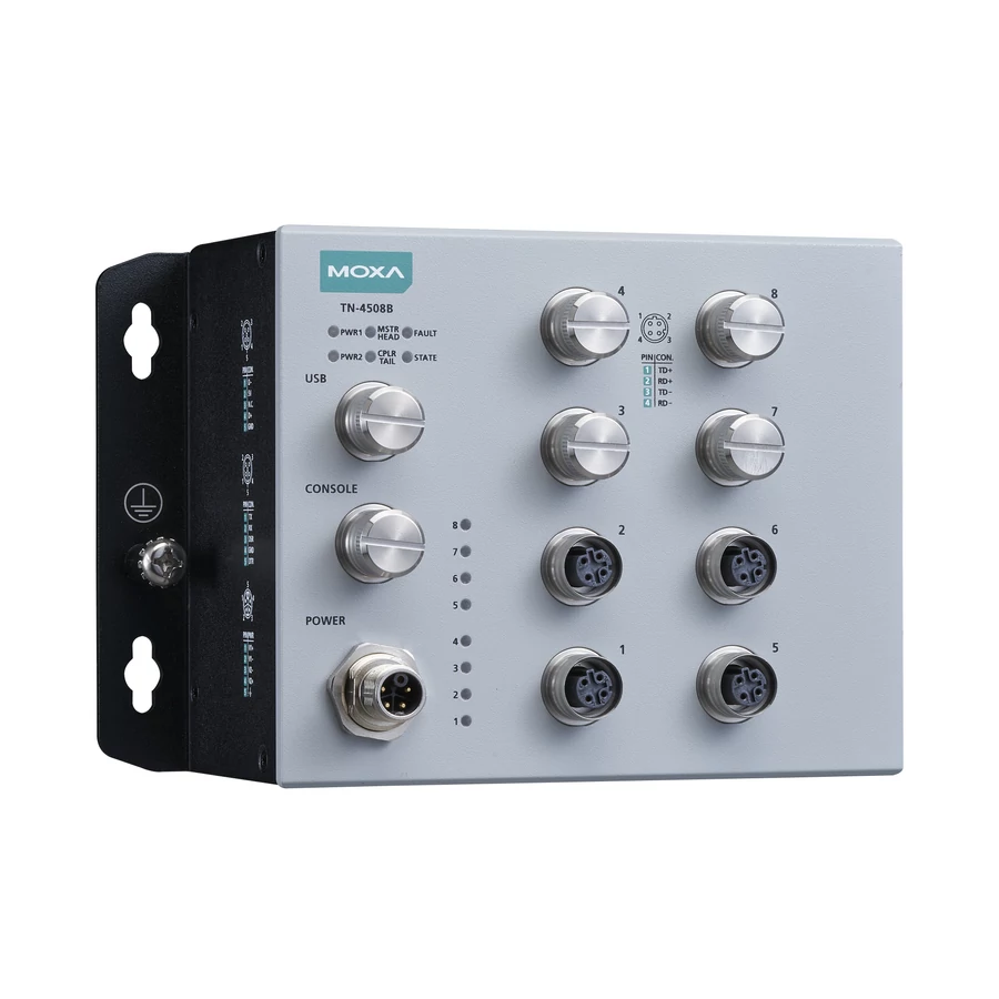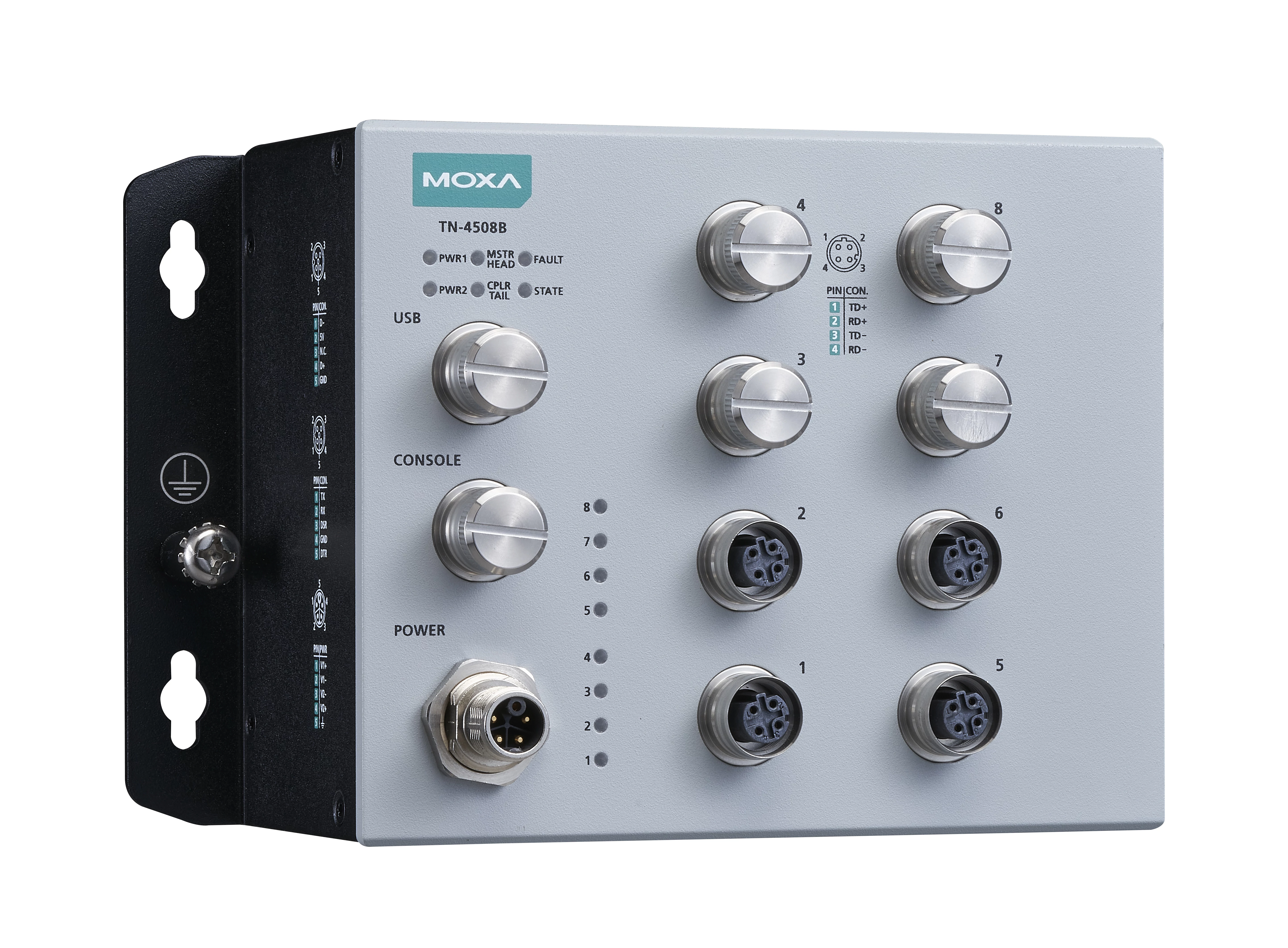 A Moxa ToughNet TN-4500B sorozatú M12 menedzselt Ethernet switcheket kifejezetten vasúti alkalmazásokhoz, többek között vasúti járművekben és a pálya mentén történő telepítéshez. A TN sorozatú switchek M12-es és más kör alakú csatlakozókat használnak a szoros csatlakozás biztosítására és a megbízható működés garantálására az olyan környezeti zavarok mellett, mint a rázkódás vagy az ütődések. A TN-4500B modellek 8-tól 28-ig terjedő Ethernet portszámmal érhetők el, PoE-funkcióval vagy anélkül. A Gigabites modellek akár 8 Gigabit porttal is rendelkeznek.