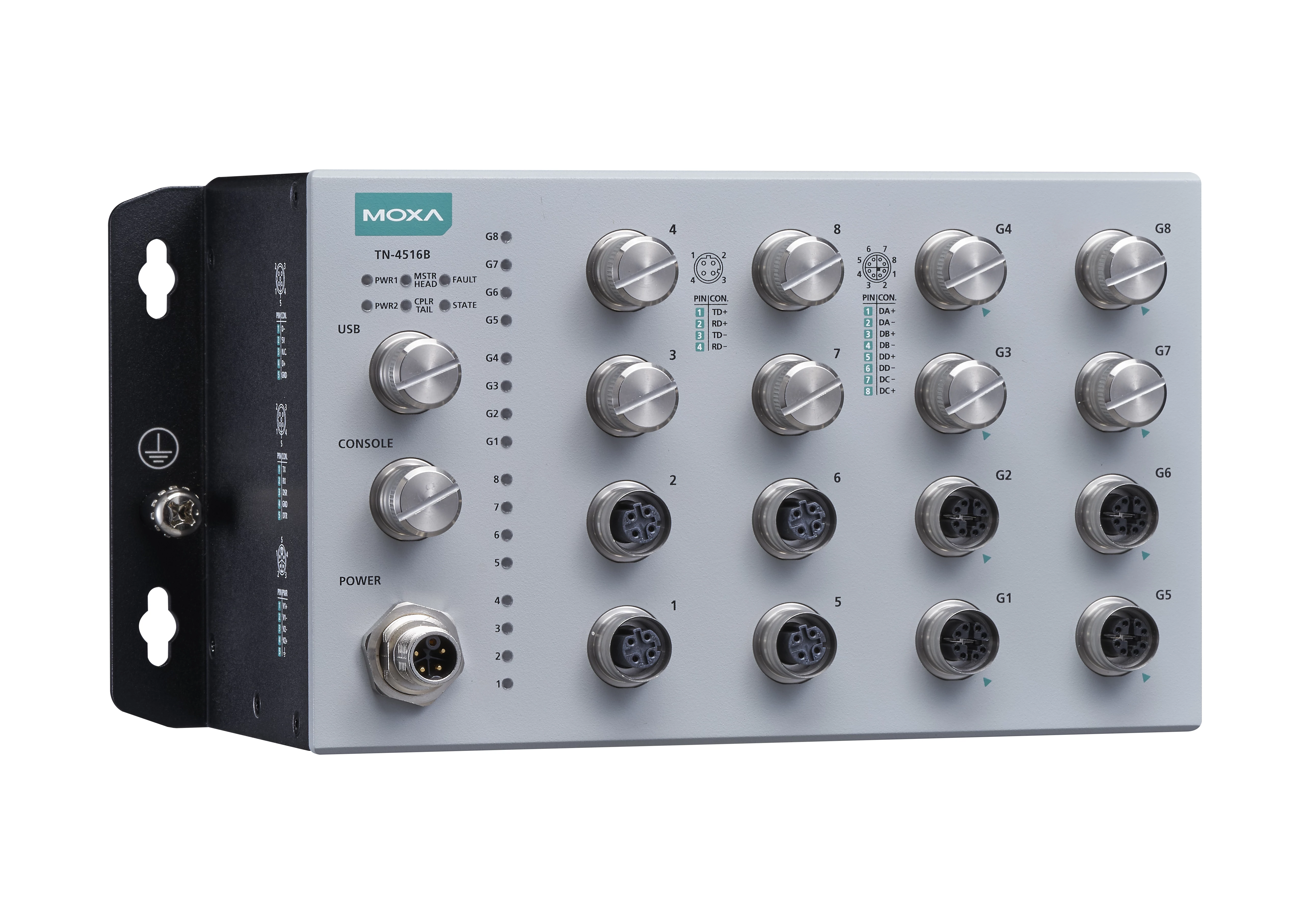 A Moxa ToughNet TN-4500B sorozatú M12 menedzselt Ethernet switcheket kifejezetten vasúti alkalmazásokhoz, többek között vasúti járművekben és a pálya mentén történő telepítéshez. A TN sorozatú switchek M12-es és más kör alakú csatlakozókat használnak a szoros csatlakozás biztosítására és a megbízható működés garantálására az olyan környezeti zavarok mellett, mint a rázkódás vagy az ütődések. A TN-4500B modellek 8-tól 28-ig terjedő Ethernet portszámmal érhetők el, PoE-funkcióval vagy anélkül. A Gigabites modellek akár 8 Gigabit porttal is rendelkeznek.