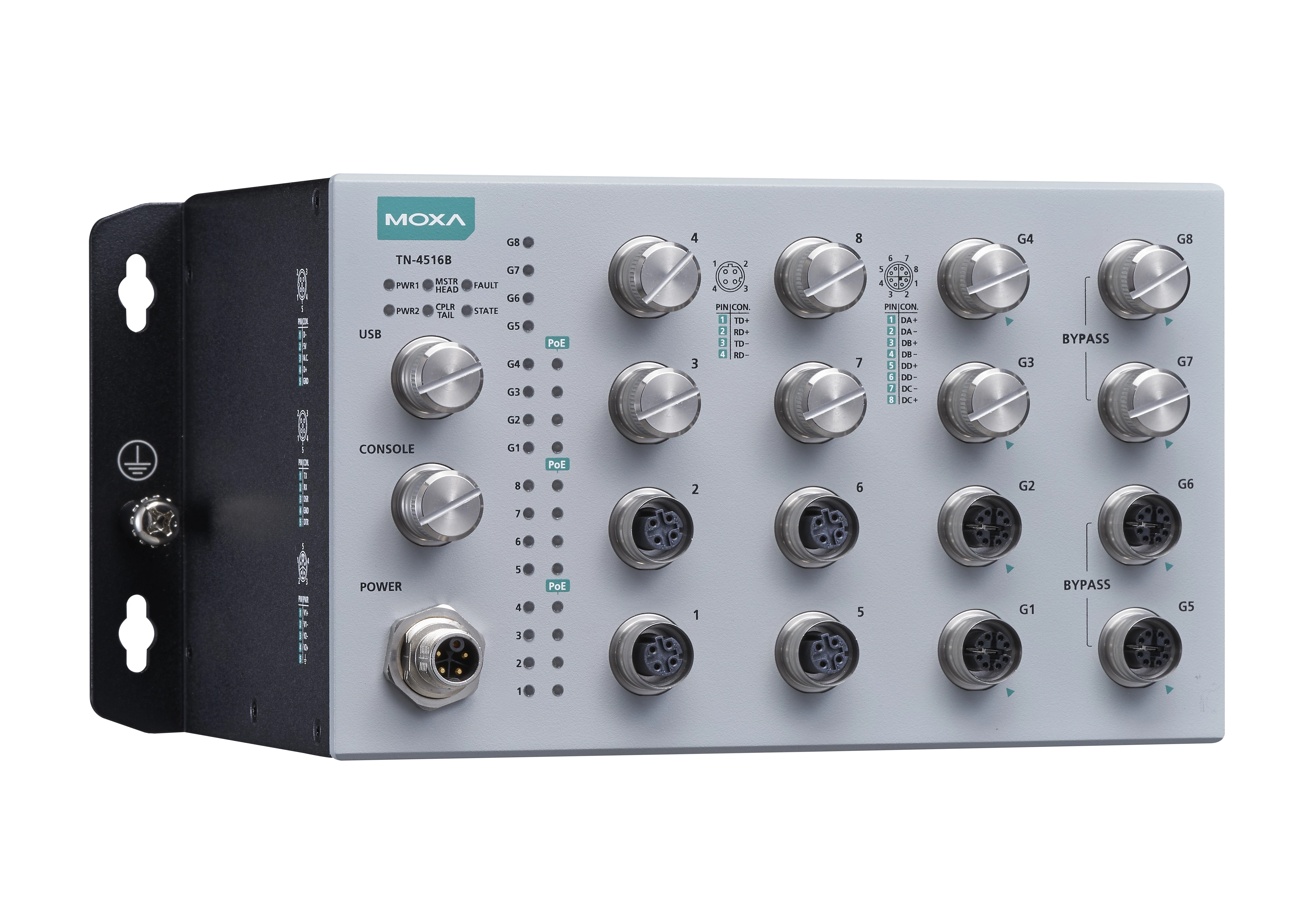 A Moxa ToughNet TN-4500B sorozatú M12 menedzselt Ethernet switcheket kifejezetten vasúti alkalmazásokhoz, többek között vasúti járművekben és a pálya mentén történő telepítéshez. A TN sorozatú switchek M12-es és más kör alakú csatlakozókat használnak a szoros csatlakozás biztosítására és a megbízható működés garantálására az olyan környezeti zavarok mellett, mint a rázkódás vagy az ütődések. A TN-4500B modellek 8-tól 28-ig terjedő Ethernet portszámmal érhetők el, PoE-funkcióval vagy anélkül. A Gigabites modellek akár 8 Gigabit porttal is rendelkeznek.