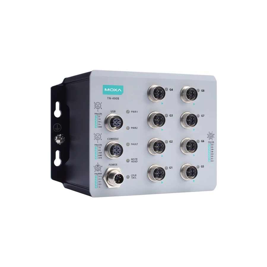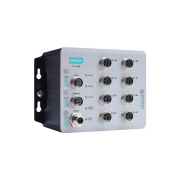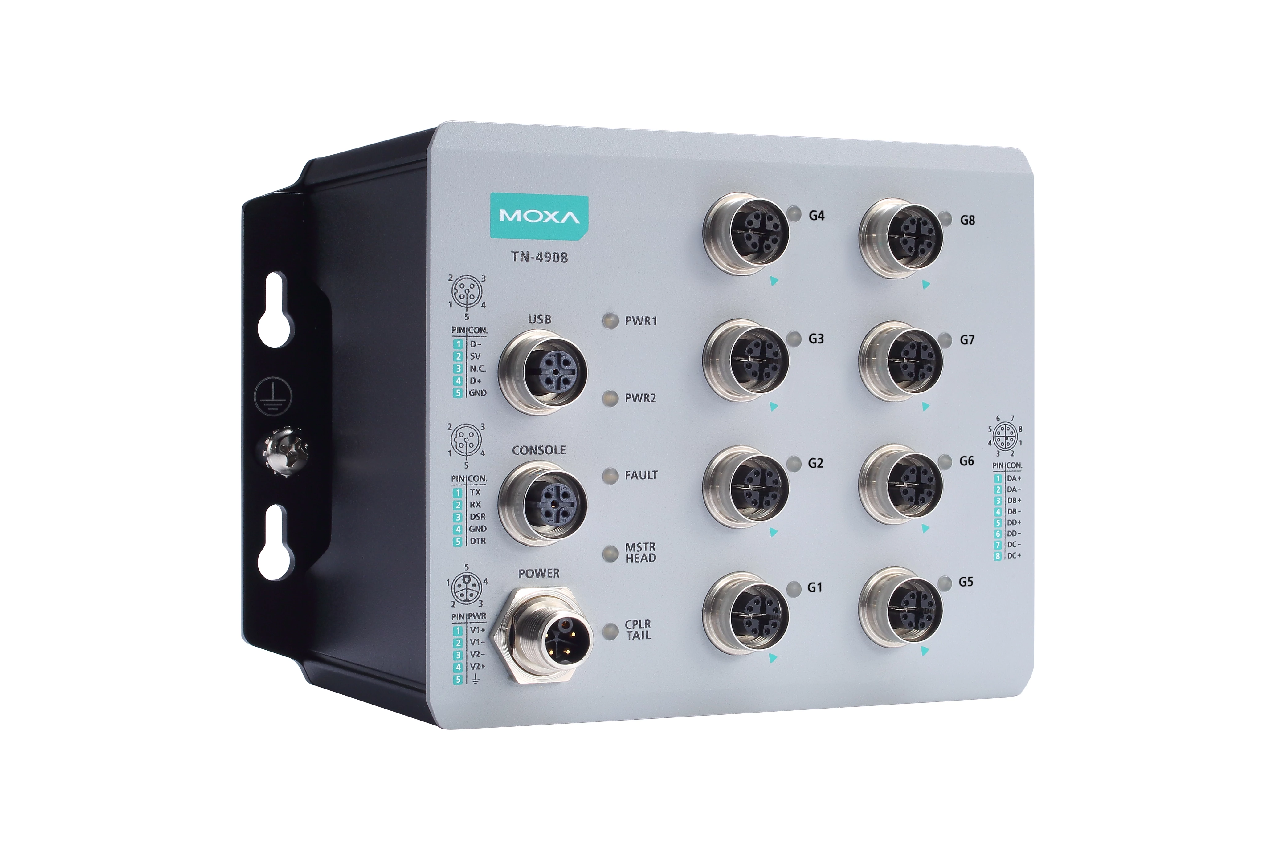 A Moxa ToughNet TN-4900 sorozatú M12 csatlakozós routercsalád, melyet vasúti alkalmazásokhoz tervezték, többek között vasúti járművekben és a pálya mentén történő telepítéshez. A sorozat 8 Gigabites portot és akár négy bypass relé portot kínál. A routerek tűzfal-, ETBN- és routingfunkciókkal rendelkeznek, megkönnyítve ezzel az alkalmazások hálózati telepítését. A robusztus M12 és egyéb kör alakú csatlakozók garantálják a megbízható működést rázkódás vagy ütés esetén is.