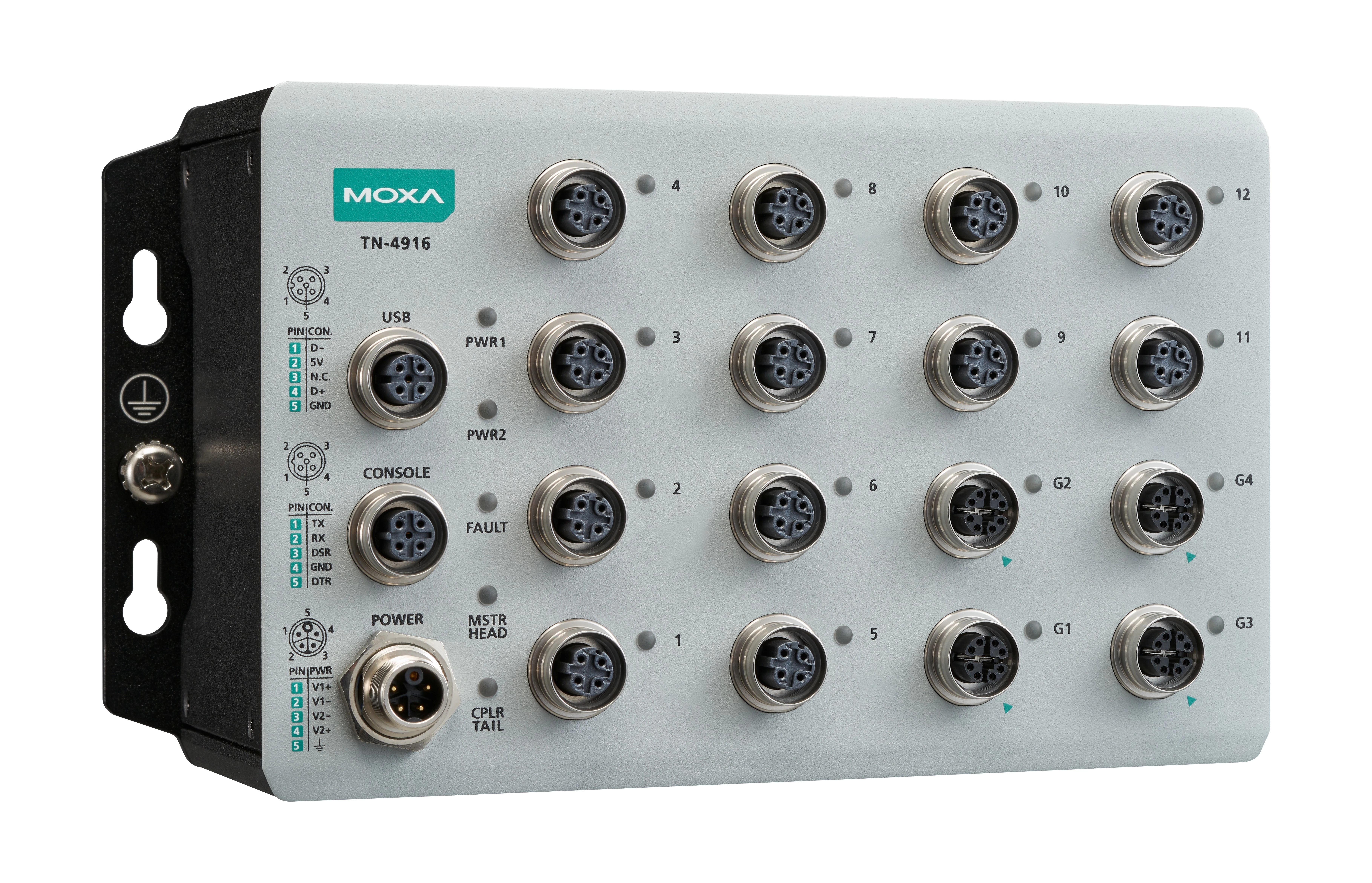 A Moxa ToughNet TN-4900 sorozatú M12 csatlakozós routercsalád, melyet vasúti alkalmazásokhoz tervezték, többek között vasúti járművekben és a pálya mentén történő telepítéshez. A sorozat 8 Gigabites portot és akár négy bypass relé portot kínál. A routerek tűzfal-, ETBN- és routingfunkciókkal rendelkeznek, megkönnyítve ezzel az alkalmazások hálózati telepítését. A robusztus M12 és egyéb kör alakú csatlakozók garantálják a megbízható működést rázkódás vagy ütés esetén is.